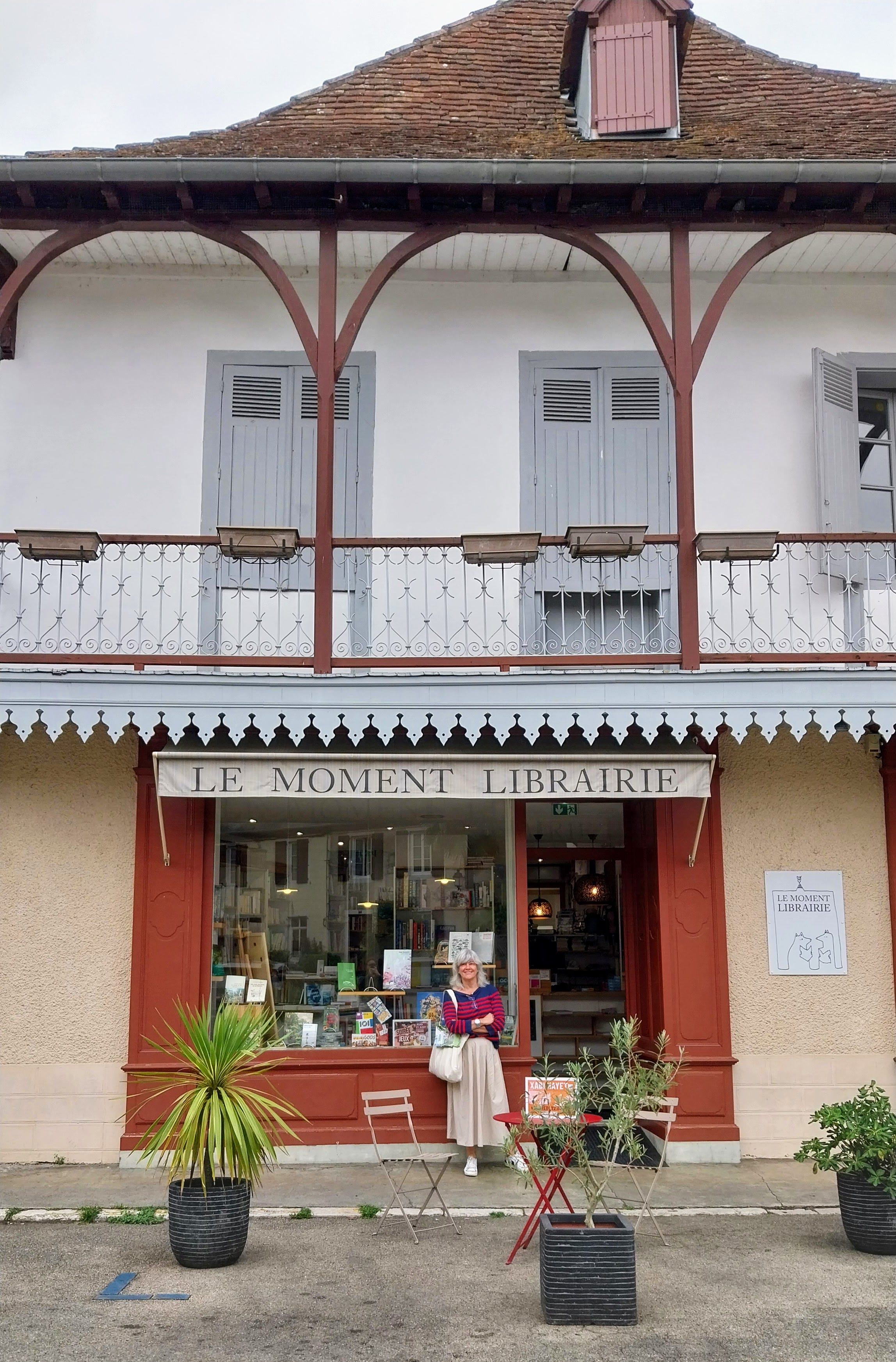 Hemos recorrido el pueblo entero sin ver apenas a nadie. Calles estrechas, casas de colores, contraventanas de madera azules, rojas, verde agua. Flores por doquier, bicicletas sin candado, Le Moment Librarie, una casa con barandas azules dando al río y las marcas de hasta donde llegó el nivel del agua cuando sucedió la última riada en 2018 (5 metros por encima de lo normal). Por supuesto, hemos visitado el monumento a los caídos en la «Gran Guerra» para comprobar cuántos hermanos habían muerto. Es algo que hacemos siempre. En 1914 cuando los hombres se enrolaban, o los enrolaban, en el ejército, todos los que eran del mismo pueblo iban al mismo batallón. A nadie se le ocurrió, porque eso no había ocurrido hasta entonces, que eso significaba que de un mismo pueblo murieran todos o casi todos los hombres o que una madre pudiera perder a todos sus hijos de golpe. En esos monumentos que hay en cada pueblo francés es terrible ver los apellidos repetidos dos, tres, cuatro y hasta cinco veces. Imaginas a esa madre, a esa mujer. A esas madres, a esas mujeres, porque es igual en cada pueblo francés que he visitado.