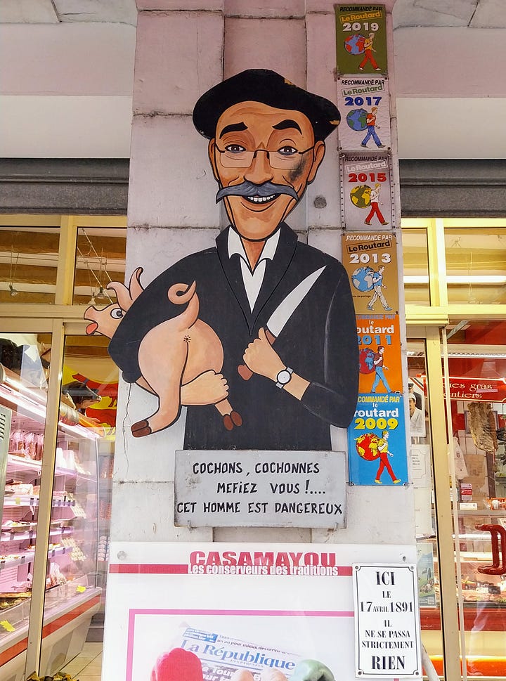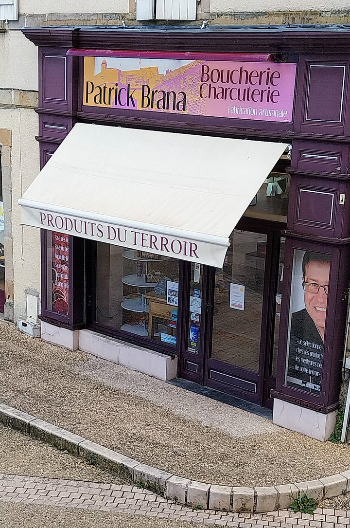 En Navarrenx había cuatro o cinco figurantes por las calles pero poco más. En estos pequeños pueblos franceses siempre me fijo en el comercio local: Olivier Photo,Sylvie & Stephane Pains Patisseries, la carnicería Casamayau, la charcuteria de Patrick Brana o la floristería local. En primer lugar me fascinan que todos lleven el nombre de pila del dueño. Nada de ser imaginativos: las fotos de Olivier y la panadería de Pedro y Marta. Después me encanta imaginar las vidas de estos comerciantes. Sin tener ni idea pienso en sus vidas tranquilas, con pocos clientes pero seguros. Clientes a los que ya conocen, a los que tienen calados y que no les dan quebraderos de cabeza. La señora que siempre va los martes para comprar algo porque viene su nieto, el matrimonio de jubilados que hace la compra cada día, el señor mayor que cada mañana va a por el pan antes de tomarse el café, la madre de familia estresada, etc. Imagino también a los clientes y me pregunto hasta qué punto compran en esos comercios por gusto, por tradición o si lo hacen porque se sienten obligados porque son tan pocos que todos se conocen y si Patrick Brana se enterara de que la señora Dupont ha dejado de comprarle a él los salchichones para irse al Carrefour de tres pueblos más allá se enfadaría tanto que le gritaría por la calle: traidora, traidora. Me pregunto también si la señora que lleva la floristería conoce todos los romances que hay en el pueblo, incluídos los secretos, o si la gente viaja al pueblo de al lado para encargar flores cuando son para sus amantes y resulta que hay un chat global de floristeros franceses que se cuentan los encargos que parecen de affaires para compartir los cotilleos.