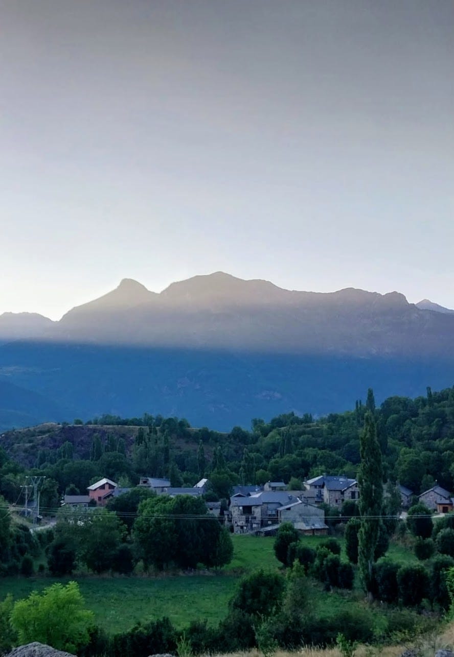 Estoy intentando pasar 10 minutos al día sin hacer nada más que mirar. Hoy los he pasado mirando cómo, al caer el sol, la sombra avanzaba por la falta de la montaña. Es una sombra distinta a la de las nubes, es una oscuridad más densa, más definitiva. Ascendía poco a poco mordiendo una a una las hileras de árboles del bosque, trepando por la ladera hasta engullir un pueblo, otro claro, unas rocas. Si nos hubiéramos quedado más la hubiera visto subir hasta el pico más alto, hasta apagar el último refulgir del día que ahora mismo, mientras escribo esto, veo desde la ventana del salón.