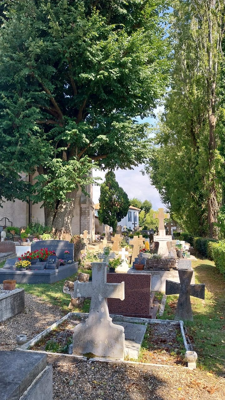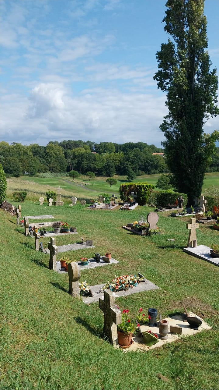 Arcangues tiene también un cementerio precioso con unas vistas increíbles hasta los Pirineos. Me chifla pasear por campos santos bonitos. Me gusta mirar las lápidas, hacer las cuentas de la edad de los muertos, intentar adivinar si alguien los recuerda todavía. Me gustan además los cementerios franceses porque tienen esa costumbre de colocar sobre las tumbas pequeños recuerdos hacia el difunto. Algunos son cursilísimos «ya estás en la eternidad con tus seres queridos». Otros parecen un poco de compromiso, un poco de compra de última hora en la tienda de souvenirs «te recordaré”. Hay muchos profesionales que me dejan loca porque no se me ocurre nada más triste que dejar un recuerdo laboral «tus compañeros de la compañía telefónica». En Francia hay también muchos de tinte militar «tus amigos de la brigada paracaidista» o «del batallón Cincuenta». Pero si tienes paciencia y paseas con atención hay joyas «Danone eres el mejor» ¿Danone? Necesito saber el porqué de ese mote. ¿Cómo era ese hombre? Puedes encontrar incluso gente que va más allá del texto. Hoy he encontrado uno que era una foto del finado subido a su tractor con una puesta de sol detrás. ¿Tanto amaba el muerto su tractor? ¿El tractor se ha quedado triste?