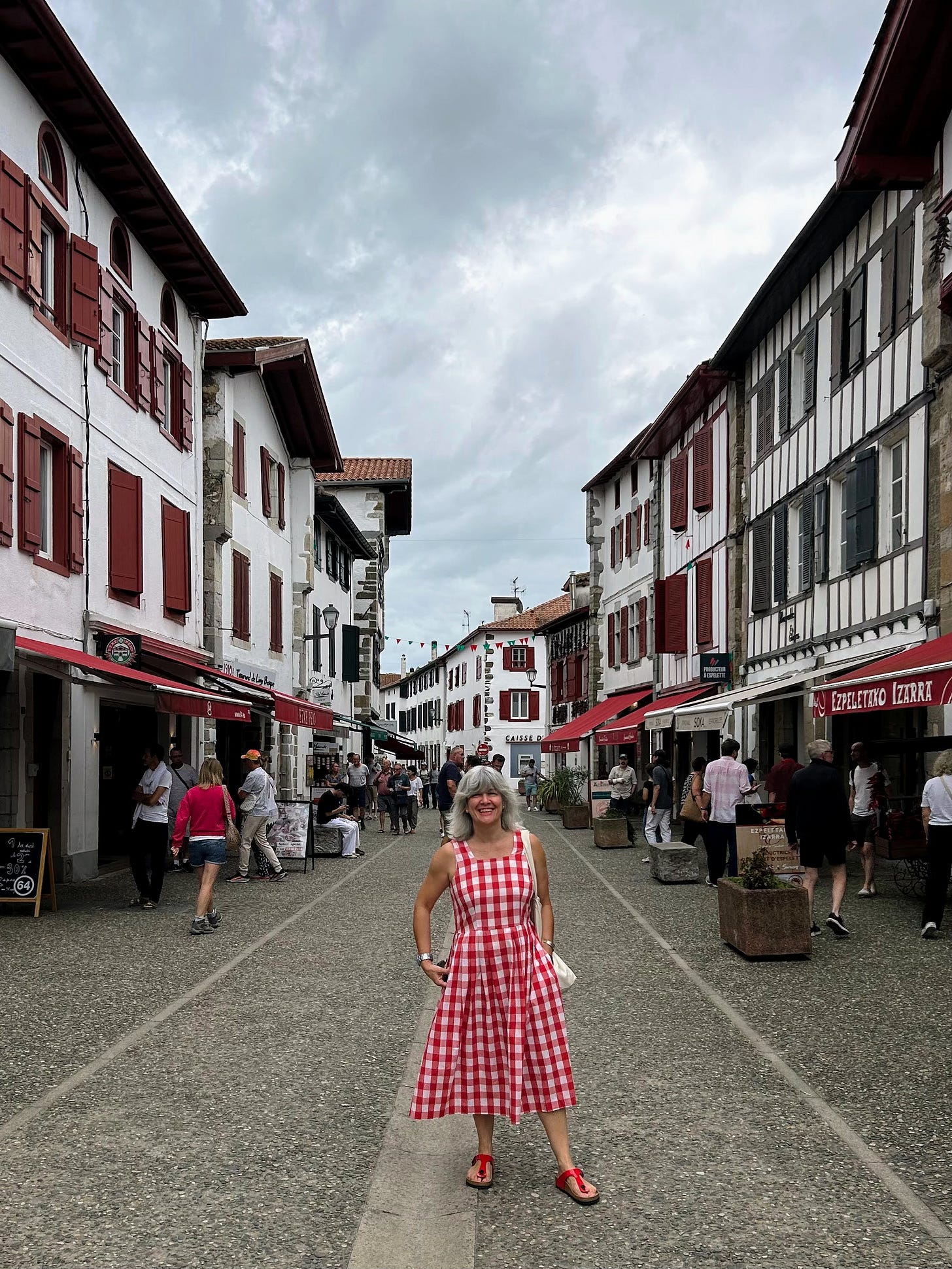 Para celebrar este maravilloso audio de mi hija Clara en el que se aprecia lo bien que me conoce y que mi muerte la apenará pero poco, hoy me he puesto el vestido de cuadros rojos y blancos que compré el año pasado en otro mercadillo francés y he estrenado las sandalias que me compré ayer. « Mamá, muy frenchie con tu vestido de mantel» Tengo unas hijas que no me merezco. Mi atuendo hoy conjuntaba a la perfección con la decoración de pimientos rojos de Espelette. Me encanta la crema de pimientos rojos y los pimientos rojos asados pero apenas los como porque me resultan super indigestos. Si decido comerlos a mediodía el resto del día es una tortura y si los como de noche tengo pesadillas terroríficas. En Espelette no he comido ni comprado ninguno. Nos hemos dedicado a pasear. Nos ha parecido que el pueblo tenía un parecido muy sospechoso con Asterix y Obelix. En el tebeo de Obelix y Compañía, el capitalismo transforma la aldea gala y en su calle brotan como setas las tiendas: una de menhires, una de pescado. En Espelete la secuencia es: una de pimientos, una de telas, una de especialidades de la región y así en bucle. Lo único que hemos comprado es una postal con muchos pimientos para regalar a un amigo que los odia. Sé que la apreciará. Nos ha sorprendido la iglesia del pueblo, completamente inesperada. Su interior de una sola nave tiene tres pisos de balcones de madera que se asoman a la nave. Provoca muchísima extrañeza porque parece un corral de comedias. « Bueno, aquí también interpretan una obra, ¿no?» ha dicho María.
