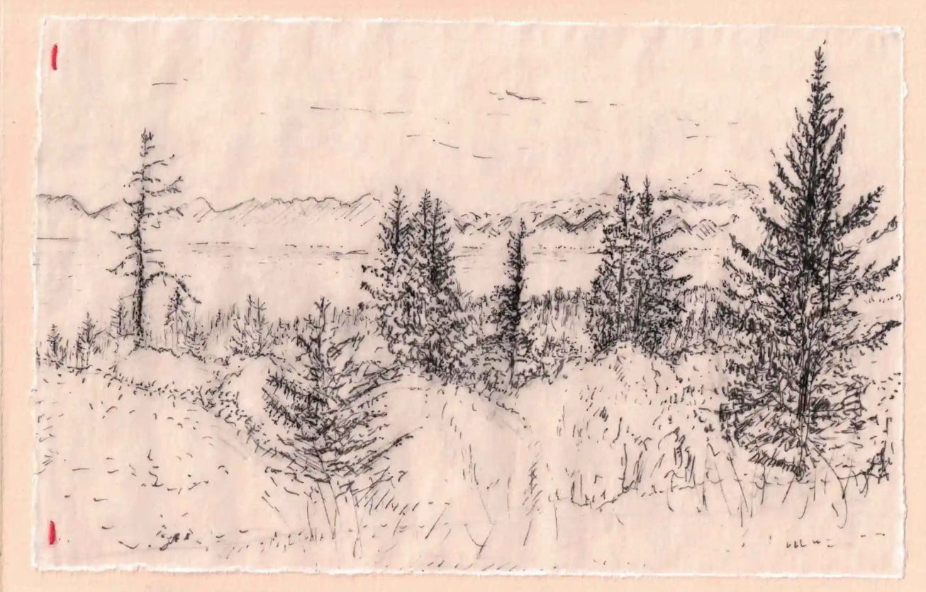 Este dibujo se titula Vista desde la cabaña de Diana y es de Hannah Sassoon. La descubrí porque escuché A Porous Place, una pieza de audio que Hannah ha hecho para la revista sonora Signal Hill.